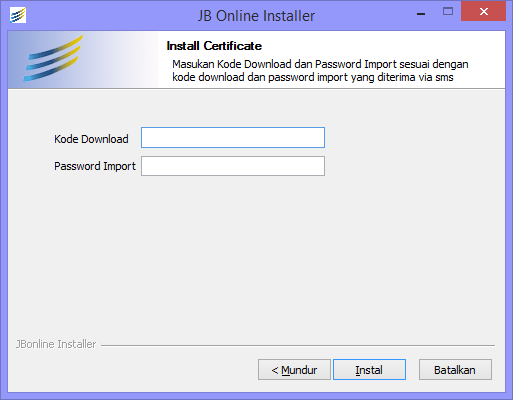 Langkah selanjutnya, masukan Kode Download dan Password Import Certifikat kemudian tekan Instal dan tunggu sampai dengan proses instalasi selesai